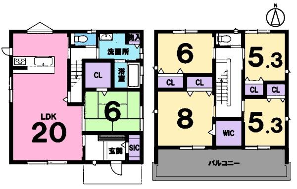 5LDK 1F LDK 20.0帖 / 1F 和 6.0帖 / 2F 洋 8.0帖 / 2F 洋 6.0帖 / 2F 洋 5.3帖 / 2F 洋 5.3帖