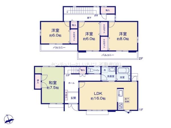 4LDK 1F LDK 16.0帖 / 1F 和 7.5帖 / 2F 洋 8.0帖 / 2F 洋 6.0帖 / 2F 洋 6.0帖