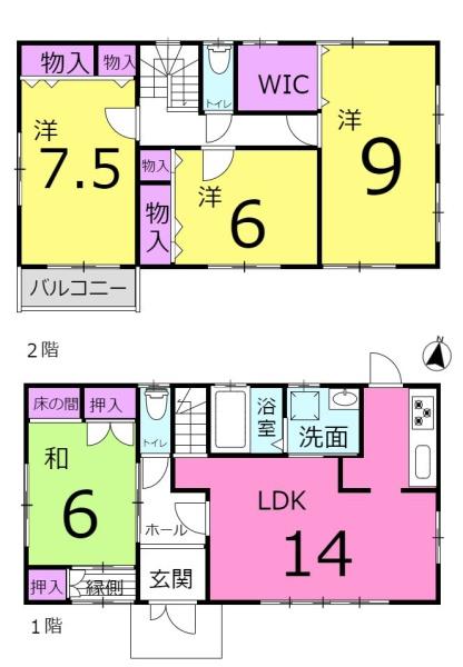 4LDK 1F LDK 14.0帖 / 1F 和 6.0帖 / 2F 洋 9.0帖 / 2F 洋 7.5帖 / 2F 洋 6.0帖